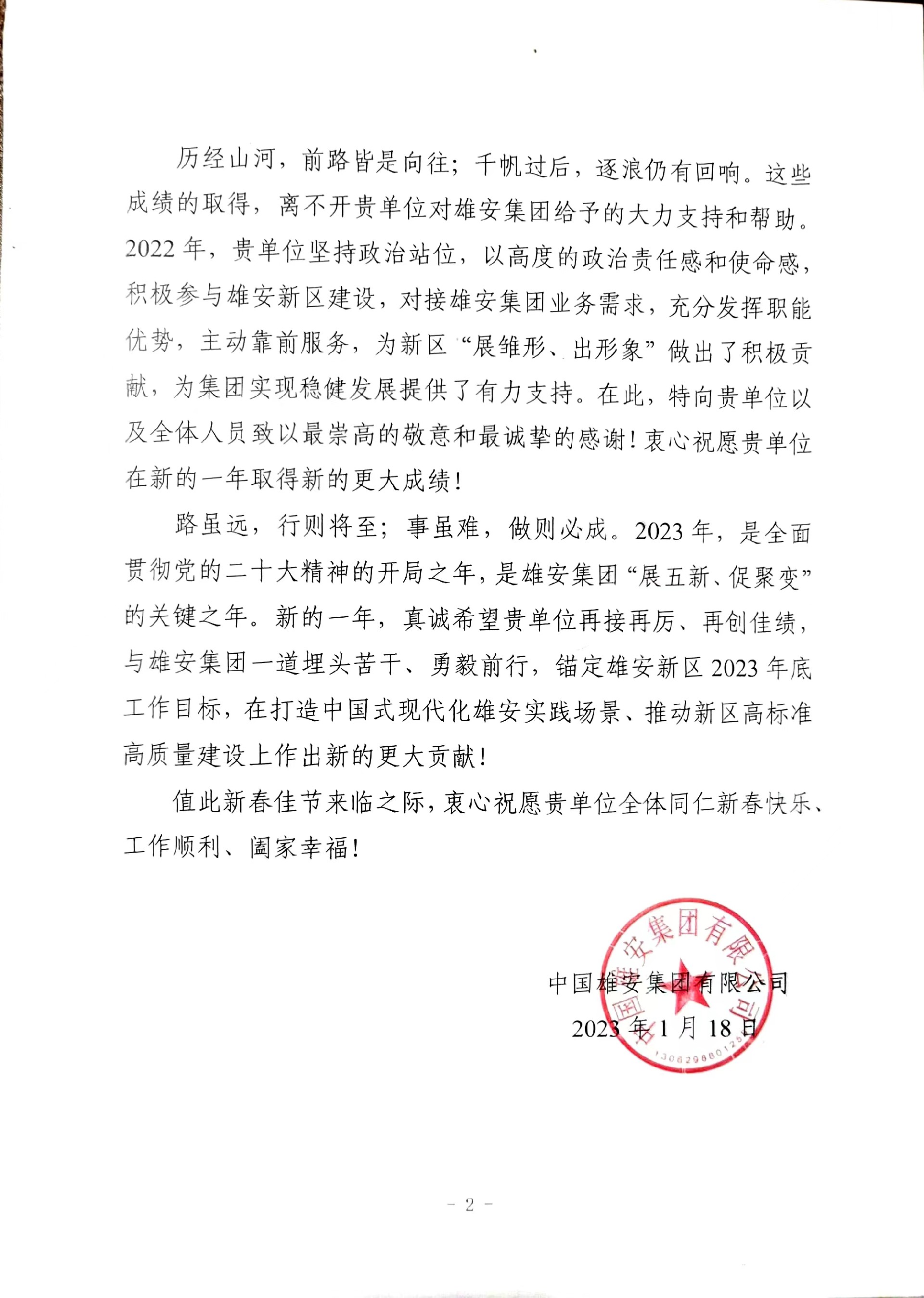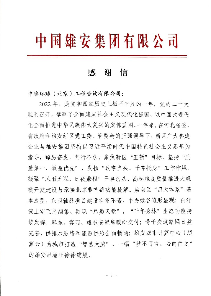 中国雄安集团对我公司发来感谢信!